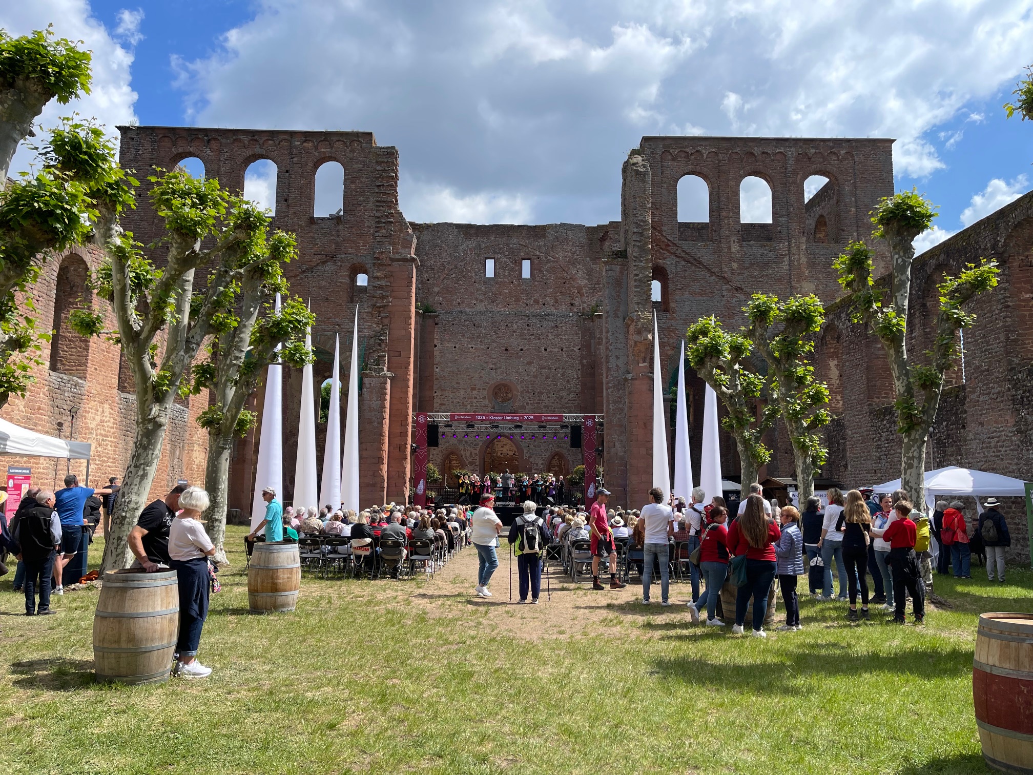 Am Sonntag, den 18. Mai, veranstaltete das Kulturbüro der Stadt Bad Dürkheim ein Chor-Picknick im Mittelschiff der Ruine. Flankiert von weißen Deko-Kegeln war die Fläche teils bestuhlt, teils legten vor allem Gruppen und Familien ihre Picknickdecken auf den Rasen. Von 10.30 bis 16.30 Uhr konnten die Zuhörer:innen verschiedenen Chöre der Region lauschen. Dabei erstreckte sich das Repertoire der Chöre von sakralen über traditionellen bis zu sehr modernen Chorgesang.