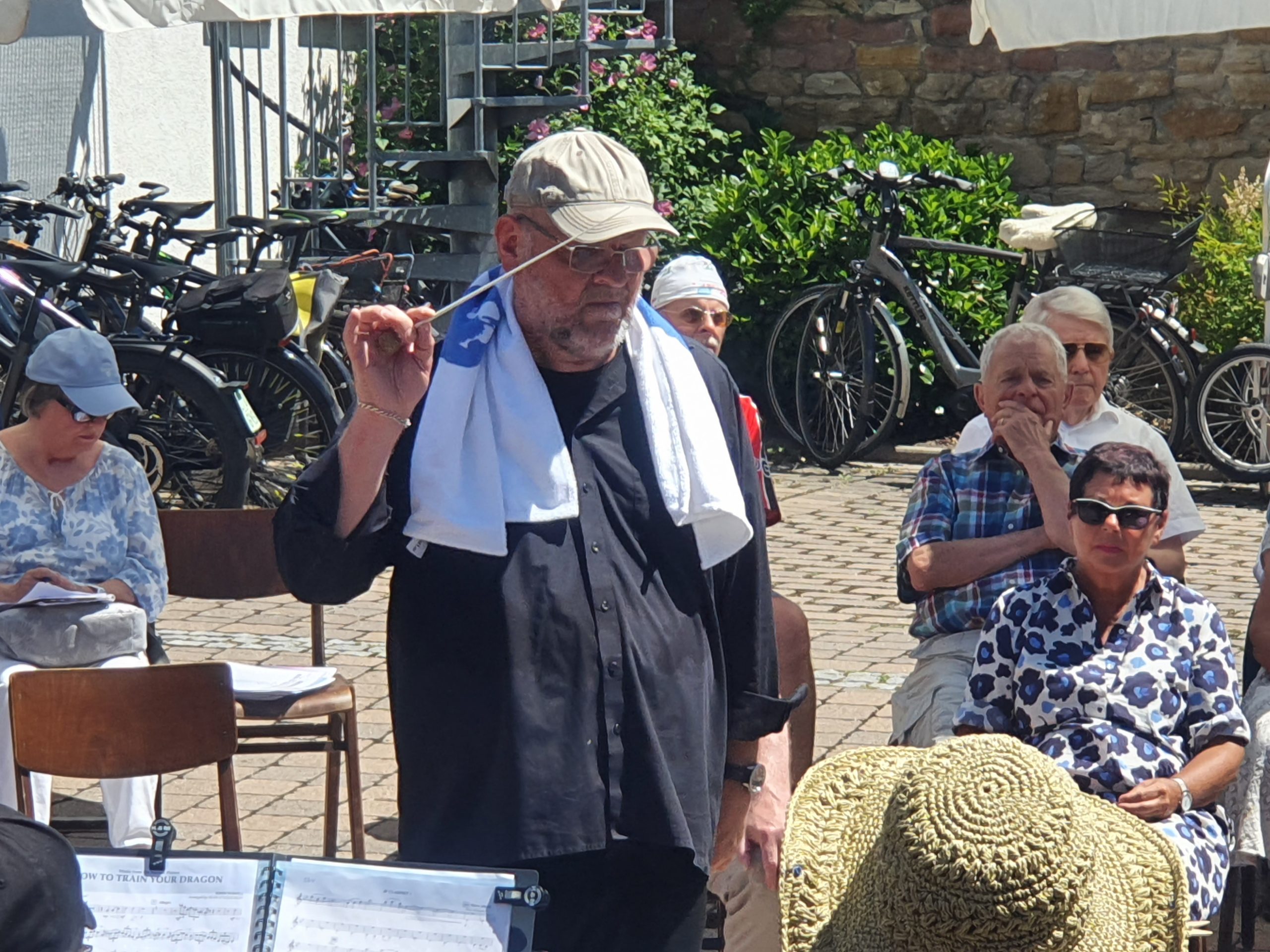 Die rund 40 Musikerinnen und Musiker und ihr Dirigent Gerhard Hüttel gehen hier mit viel Elan und unbändiger Freude an der Musik „zur Sache“.